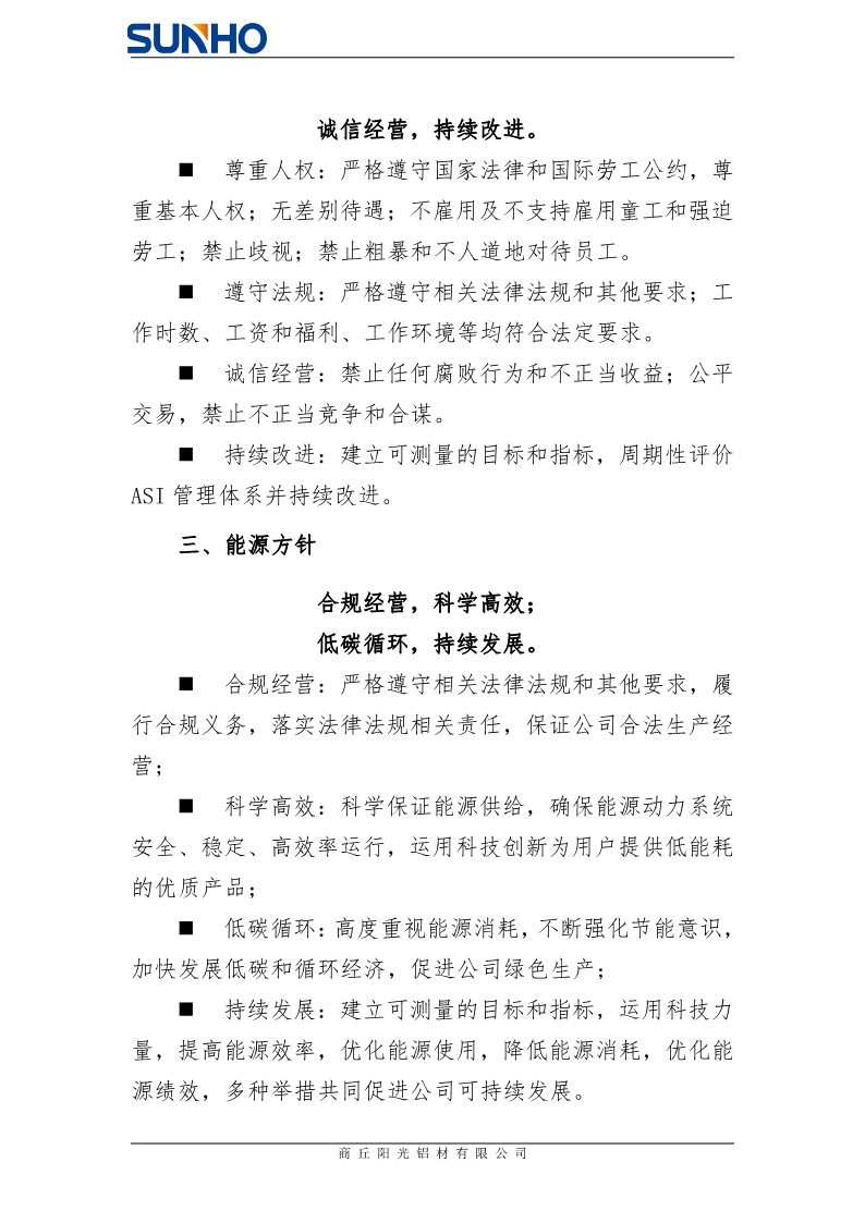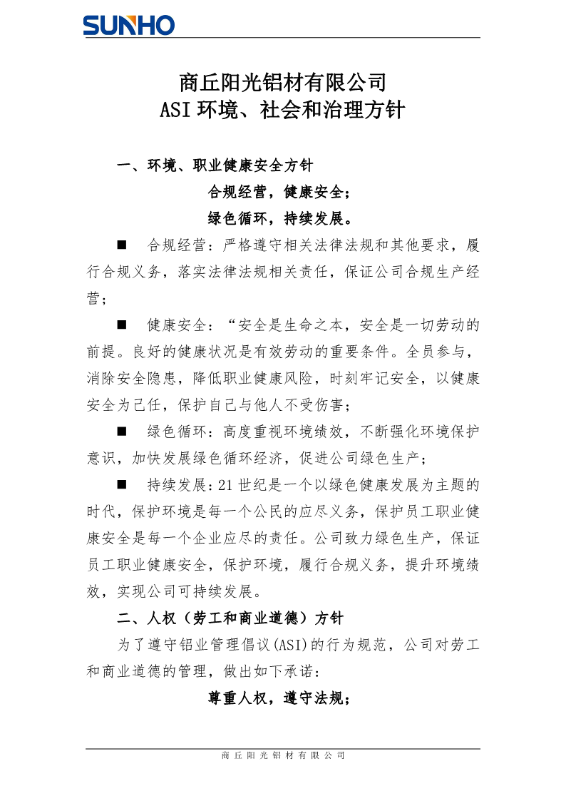 商丘阳光铝材有限公司能源、环境、社会和人权方针